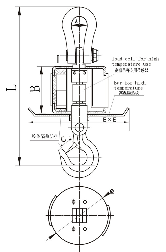 10~50噸吊秤高溫隔熱板尺寸E×E為623×623,板重20kg。